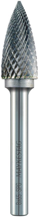 Pilnik obrotowy stożkowy do metalu Alpen wykonany jest z węglika spiekanego z uzębieniem naprzemianskośnym (krzyżowym), takie uzębienie znacznie zwiększa wydajność skrawania w porównaniu z frezami o uzębieniu zwykłym, widoczne jest to zwłaszcza podczas obróbki materiałów z dużymi prędkościami frezowania. Frez trzpieniowy przeznaczony jest do obróbki stali hartowanej i spawów spawalniczych o wysokiej odporności na rozciąganie.