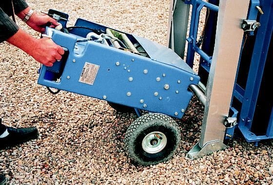 Podwozie transportowe służące do wygodnego transportu jednostki napędowej wyciągu w czasie jej montażu lub demontażu. Zespolenie wózka z drabiną przy zamontowanej jednostce napędowej pozwala na wygodny transport złożonej drabiny (jednostka napędowa zamontowana na szynie podstawowej stanowi wózek, pozostałe zdemontowane segmenty można umieścić w koszu transportowym). Waga: 11 kg